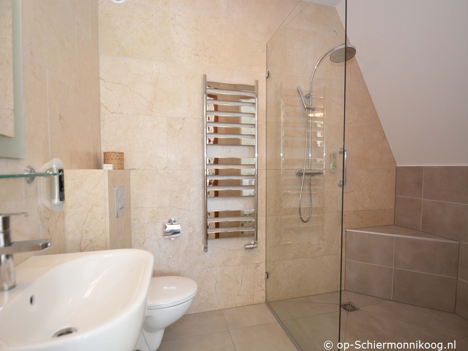 Bathroom with walk-in shower, wash basin and WC.